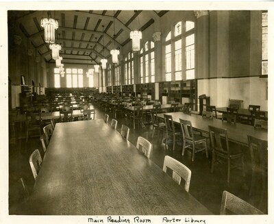 Black and white photo of the main reading room of Porter Library, at the time unoccupied, with many tables and chairs. The room has a high, vaulted ceiling and hanging lights.