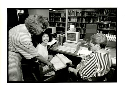 Black and white photo of two librarians assisting a student as she researchers on the Music Index ERIC (Education) computer.