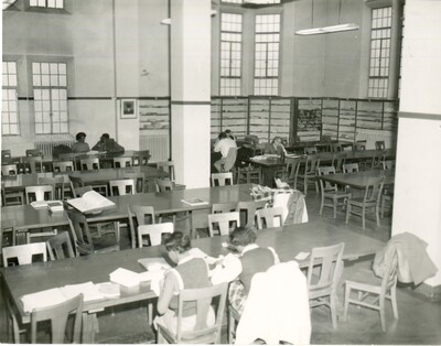 Black and white photo of the reading room, students study at desks, c. 1950s