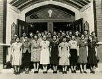 Black and white photo of Porter Library's student assistants standing in a large group at the front doors of the library. Each student has a number written on them.