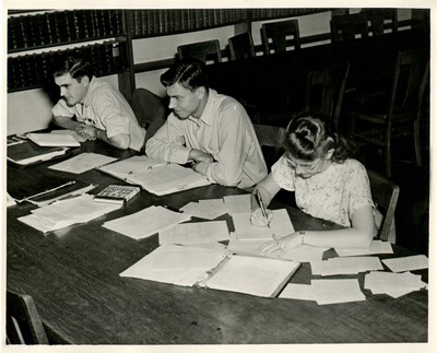 Black and white photo of students studying at tables in Porter Library, c. 1940s or 50s