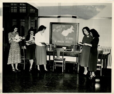 Black and white photo of five women checking out a display in Porter Library, "Are These the 'Reds'? 50 Books, 50 Magazine Articles," with a map of Russia on the display board. The women are reading some of the books and articles available.