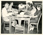 Black and white photo of a group of people, possibly librarians, having a meeting at one of the library tables, which is covered in papers, notes, and books.