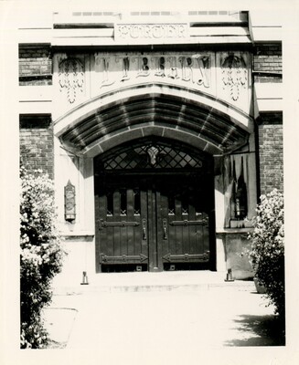 Black and white photo of the front doors of Porter Library.