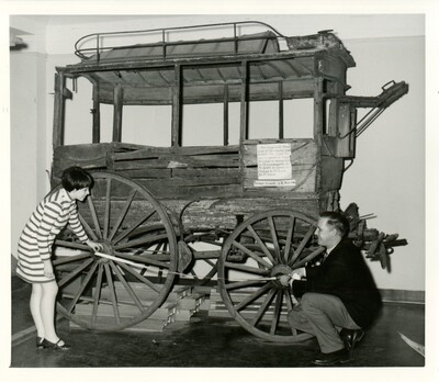 Black and white photo of Norman Tanis and student Julie Vineyard looking at the stagecoach "Daisy"