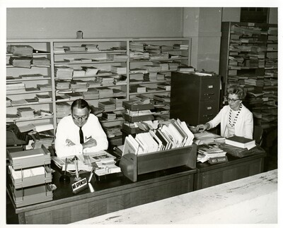 Black and white photo of Mr. Spencer and Mrs. Duggan at their desks in Porter Library.