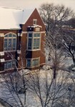 Color photo of Porter Hall in the winter. The building, ground, and trees are covered in snow. Possibly taken from Horace Mann.