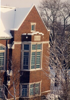 Color photo of Porter Hall in the winter focusing on the western wing. The building, ground, and trees are covered in snow. Possibly taken from Horace Mann.