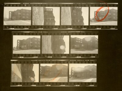 Scanned negatives of the exterior of Shirk Hall. Two photos, identifiers Shirk001 and Shirk002 were printed from these negatives