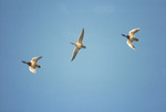 Three mallard ducks in flight