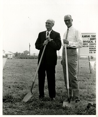 Black and white photo of Garfield W. "Doc" Weede and Dr. George Budd holding shovels and posing for photos at the groundbreaking ceremony for the Weede Physical Education building.