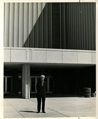 Black and white photo of Garfield W. "Doc" Weede standing in front of the physical education building dedicated in his name.
