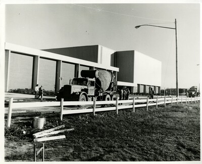 Black and white photo of a construction crew laying the concrete for the road (Homer) in front of the Weede building. They follow behing an American Concrete Co. truck.