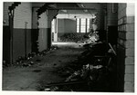 Black and white photo of the razing of the gymnasium. Taken from the interior, the hallways have been broken down, the materials of the walls and doors piled on the floor.