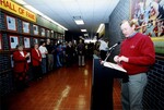 Color photo of a man, possibly Dr. Bryant, then president of the university, speaking at a podium during the ceremony to celebrate the finished renovations in the Weede building.