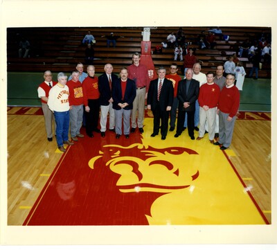 Color photo of 15 men standing on the split-face logo on the basketball court for the dedication of the court.