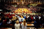 Color photo of a PSU Men's Basketball game taken from the bleachers. The bleachers are filled with spectators. The band has their music sheets out, the cheerleaders stand in a pyramid.