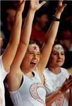 Color photo of the crowd at a Women's Basketball game, PSU v Washburn. The photo is focused on a student, she is cheering, wearing a tanktop with an S written on it. She and the girl next to her (wearing a tanktop with an exclamation point written on it) wear stickers on their faces. Together with other students, they spell GORILLAS!