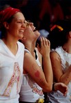 Color photo of the crowd at a Women's Basketball game, PSU v Washburn. The photo is focused on two students cheering, they are wearing tanktops with individual letters written on them (together spelling GORILLAS!). They've decorated their faces and drawn on their arms.