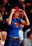 Color photo of the crowd at a PSU Men's Basketball game. The photo focuses on a student wearing a Superman shirt and red cowboy hat, she looks both excited and in anticipation as she watches the game.