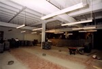 Color photo of renovations in the Garfield W. Weede building. A construction crew is laying a concrete brick wall for what will be the new locker rooms.