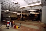 Color photo of renovations in the Garfield W. Weede building. A construction crew is laying a concrete brick wall for what will be the new locker rooms.