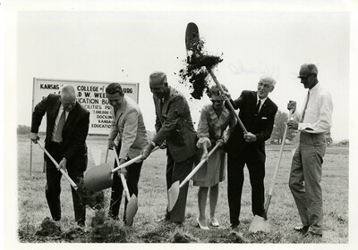 Black and white photograph of 6 people, likely Kansas State College of Pittsburg employees, digging into an empty lot with shovels to "break ground" for the upcoming construction of the Physical Education building. Back of the photo is labelled "Doc Weede," the building is named after Garfield W. "Doc" Weede, athletics coach.