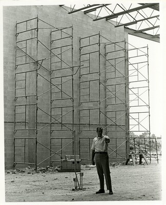 Black and white photo taken during the construction of the physical education building. A large concrete brick wall has been erected with scaffolding running up the side and metal beams for the roof. An unidentified man stands in the center, pointing toward the camera.