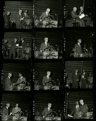 Black and white slide scans of speakers inside the Weede Gymnasium during the dedication of the building. They stand at a podium surrounded by plants. One of the speakers is Garfield W. "Doc" Weede, of whom the building is named after.