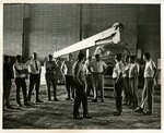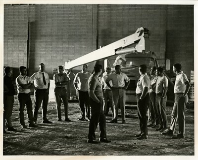 Black and white photo of a large group of mean inspecting the construction process of the Weede Gymnasium. At the time, large cement brick walls have been constructed and the floor is covered in dirt.