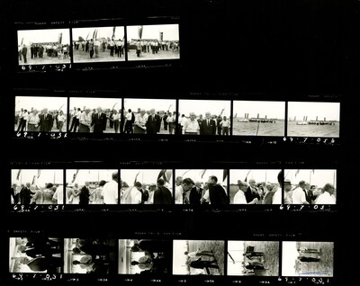 Scanned negatives of the breaking ground ceremony for the Garfield W. Weede physical education building. Many people gather and talk. Garfield W. "Doc" Weede is present and poses for some photos.