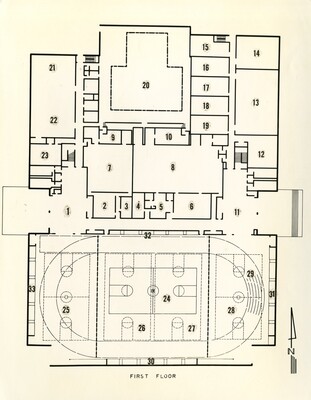 Black and white printed plan of the first floor of the Weede building. The rooms and areas of the floor are numbered 1-33 but not further defined.