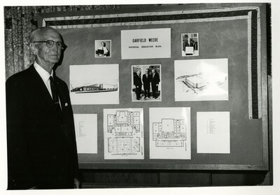Black and white photo of Garfield W. Weede standing next to a concept board for the upcoming gymnasium which includes floor plans, concept art of the building, and photos of Weede.