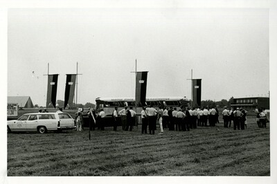 Black and white photo of a crowd of people standing in a field to celebrate the groundbreaking ceremony for the Garfield W. Weede building. The field has been decorated with flags-- 2-color vertical banners with a crown on them-- a car with illegible writing on the door, and a Kansas State College of Pittsburg bus.