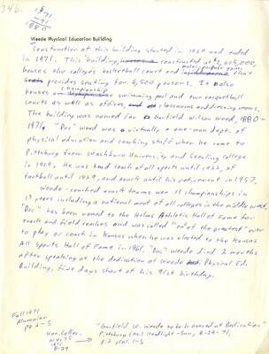 A handwritten draft about Garfield W. Weede and the building named after him. Unknown what photo this was published with, if at all. Page mentions the Fall 1971 Alumnian pg. 2-5 or the August 29, 1971 Headlight-Sun, pg. 2, col. 1-5, possibly where information came from. Reads: