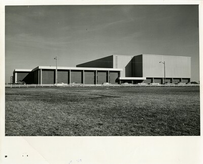 Black and white photo of the completed Garfield W. Weede Physical Education building as seen from across the street on the practice field.