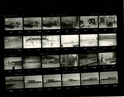 Black and white scanned negatives of various equipment, a classroom, the pool, the court, and the exterior of the building.