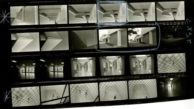 Black and white scanned negatives of the exterior and interior of the Weede building. The inside shots are of the front doors, hallways, and basketball and racqetball courts.