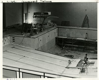 Black and white photo of two construction workers painting the bottom of the championship swimming pool inside the Weede building.