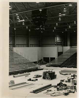Black and white photo of the basketball court during construction. Materials for the bleachers or on the court, some of the bleachers have been constructed already.
