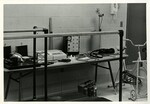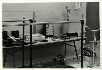 Black and white photo of exercise and monitoring equipment in a classroom in the Weede building.