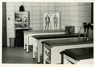 Black and white photo of a Physical Education classroom with exam tables and a diagram of the human muscular system. A medicine cabinet is full of supplies.