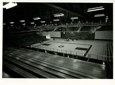 Black and white photo of the basketball in Garfield W. Weede building. People are setting up for the dedication ceremony.