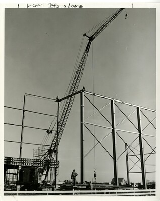 Black and white photo of a crane on the construction site of the Garfield W. Weede building. A steel frame is being constructed, the crane is connected to steel beams on the ground.