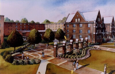 Color painting of the Lindsburg Plaza design concept. The square brickwork, pillars connected by vines, and the trees are all present in the concept. The "Cadence" sculpture and fountain by Jon Haverene is not.