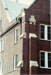 Color photo of an exterior corner of Willard Hall showing the sculpted cement accents and the old decorative gutter.