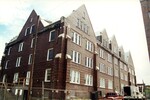 Color photo of the exterior back and side (southwest) of Willard Hall showing the windows, peaked roofs, and construction vehicles during renovation.