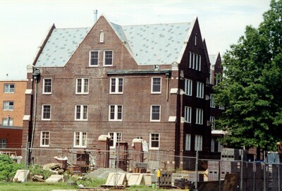 Color photo of the west exterior (facing away from campus) of Willard Hall during reconstruction. The lawn is fenced off and stacks of brick cover the yard.