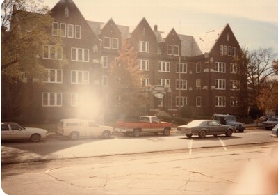Color photo of Willard Hall with cars parked out front. A second sign hangs below the "Frances Willard Hall for Girls 1923" engraving, but cannot be made out. Potentially a Campus Security Office sign as Willard served as that space for a period, at least in 1970.