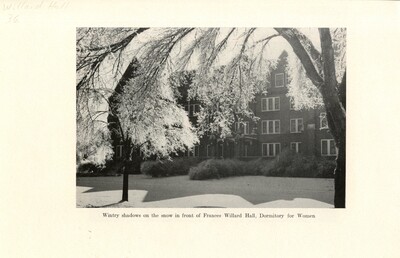 Black and white photo featured in an unidentified publication of Willard Hall in the snow. The trees are covered in ice. Photo caption reads "Wintry shadows on the snow in front of Frances Willard Hall, Dormitory for Women."
